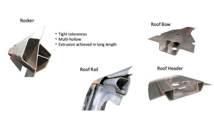 Roof header materials must be high in tensile strength, low in weight to lower the vehicle center of gravity, high in toughness, and integration-friendly. A commonly utilized alloy utilized is 6082 aluminum, a which delivers strength, toughness, extrudability – and that converts multiple steel stampings to an efficient, one-piece extrusion on Ford’s flagship vehicle, the F-150.